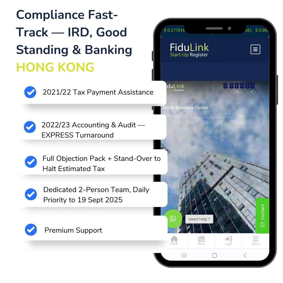 Tags: Hong Kong, IRD, Good Standing, Certificate of Good Standing, régularisation fiscale Hong Kong, comptabilité Hong Kong, audit Hong Kong, objection IRD, stand-over of the tax in dispute, PTR, audited financial statements, tax computation, déclaration 2022/23, retard de déclaration 2021/22, remise partielle impôts, pénalités 5-10%, introduction bancaire Hong Kong, ouverture de compte bancaire, conformité KYC AML, due diligence, Companies Registry, package express, équipe dédiée comptable juridique, dépôt avant échéance, optimisation trésorerie, accompagnement juridique fiscal, FiduLink, société Hong Kong, assistance paiement chèque IRD, package 4999 €, banque exigence Good Standing